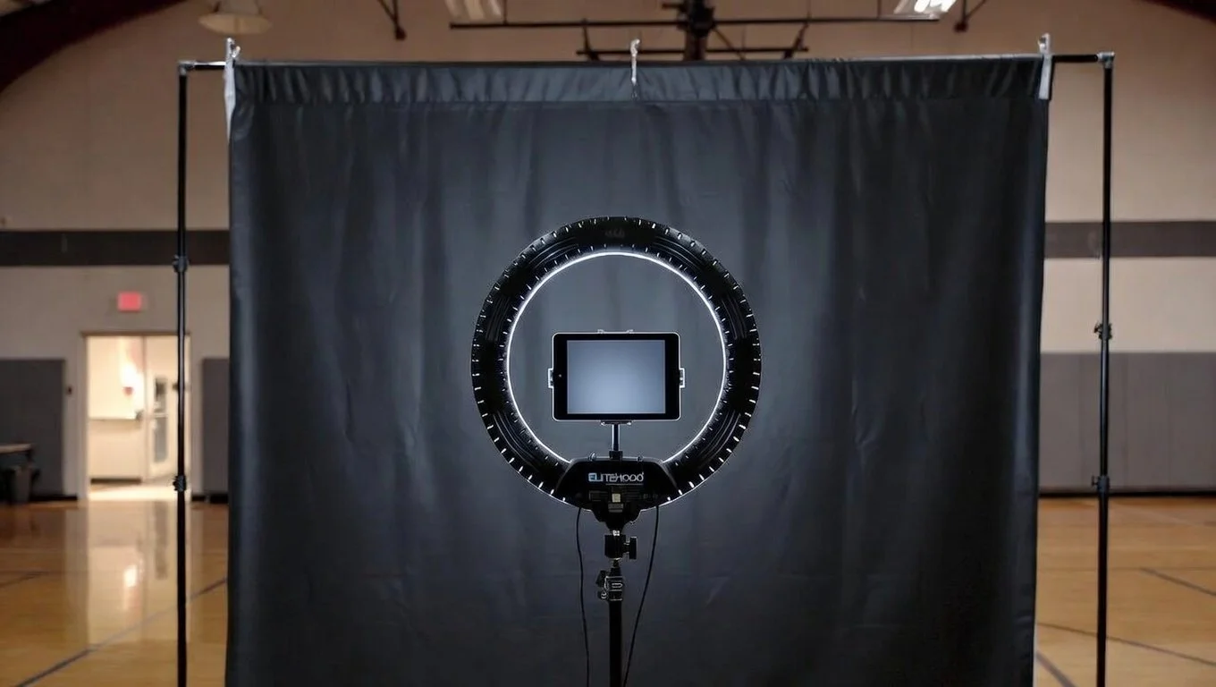 Includes - Set up & Tear down, Curtain Backdrop, Ipad & Ring Light stand, images texted or emailed to individual recipients in live time.